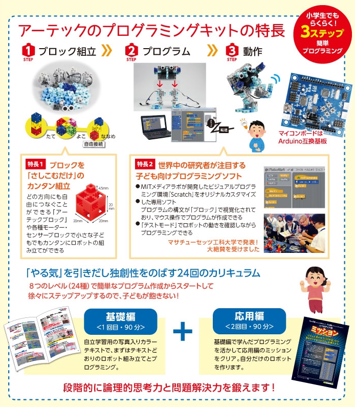 スクラッチ(Scratch)をオリジナルカスタマイズした専用ソフトスタディーノを使用して、全24回のカリキュラムにてロボットプログラミングをステップアップしていきながら学びます。 |